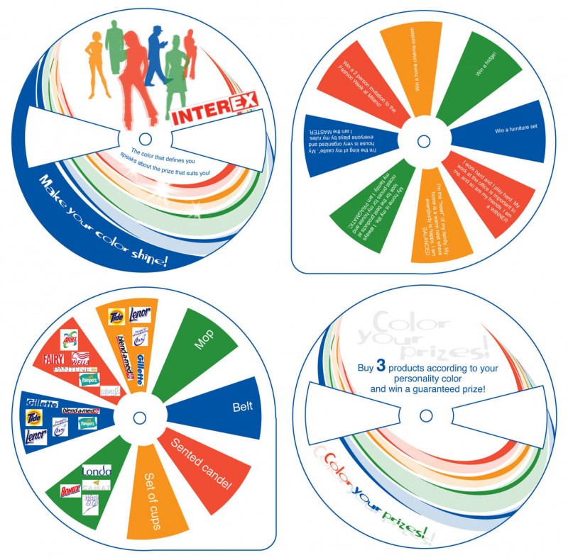 P&G Professional interactive brochure.P&G Proffesional is a programme that Procter & Gamble developed with en-gros retaileres such asa Selgros and METRO which promotes P&G products offers and special packaging for HoReCa user and other non-household users.This round shape brochure has a capsule the middle which bond the two rotating parts. The cut windows allow reading messages on diagonal. Each color depicts a specific area where the products are to be used.